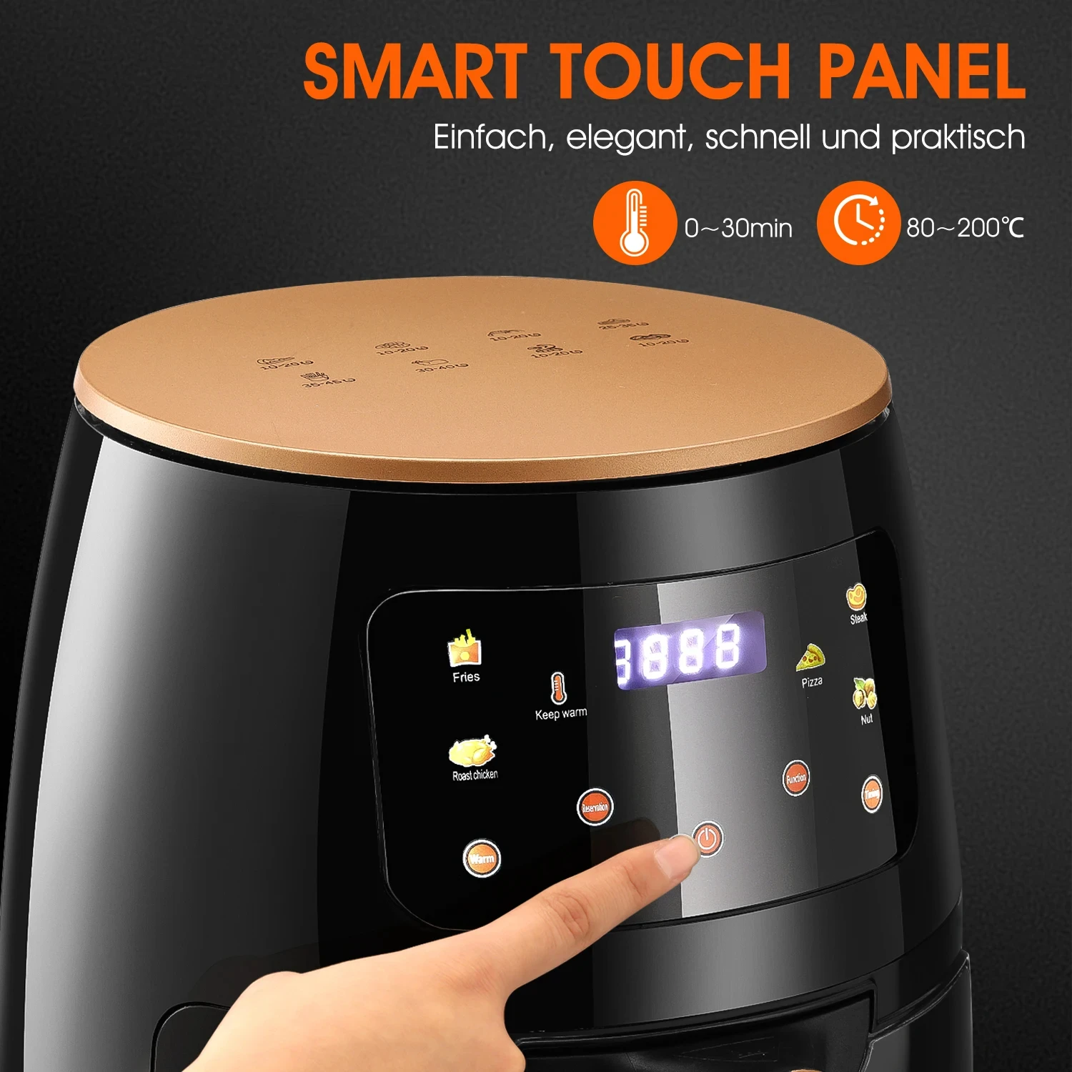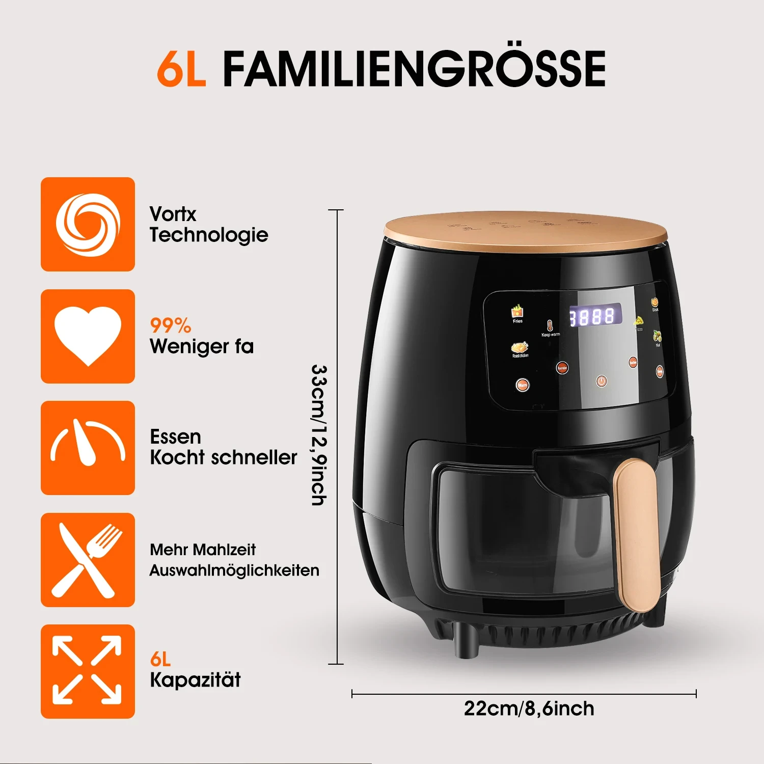 Large digital LED display Multi-cooking functions, digital one-touch touchscreen control panel (steak, fries, pizza, chicken, nut, keep warm, reservation, Timing, Temperature) easily readable and accessible. Ideal for a modern lifestyle and kitchen! Fast cooking Air Fryer cooks up to 45 % faster than a conventional oven. Thanks to its powerful 1400 watts, the hot air fryer is an all -rounder. You need almost no preheat and cooks in just a few minutes. The efficient cooking method even saves cooking time! Easy to use Hot -called temperature and time can be set manually; Washing is simple, fast and effortless; The baskets and roses are dishwasher -safe and are guaranteed to make everyday life easier. quiet and without smoke The Airfryer XL offers you a smoke -free, quiet cooking experience and warns you after cooking so that you do not miss delicious meals! Hot air fryer are faster and more energy -efficient than conventional ovens. With the 360 ° hot air circulation technology, your dishes become uniquely delicious. Healthier nutrition Reduces the fat content by a whopping 90% and at the same time grates crispy and delicious all of your favorite dishes, reduces calories, trans fats and carcinogenic substances, an oil -free diet can help reduce the following risks such as high blood pressure and heart disease. Performance: 1400W Tension: 220-240V Frequency: 50Hz Capacity: 6l Temperature: 60-200 ° C; Timer: 1-70 min Interior pot: non-stick Material of the shell: food quality environmentally friendly PP material Heating method: three-dimensional ambient heating Large LED touchscreen tal size: 6L: 22x22x31cm 1x Air Freyer & Free Accessories (6L) 1x guide Please note: Since the capacity of the hot air fryer is 6 L, it is recommended when roasting a whole chicken that the weight of the entire chicken is a maximum of 1500 g. Specifications