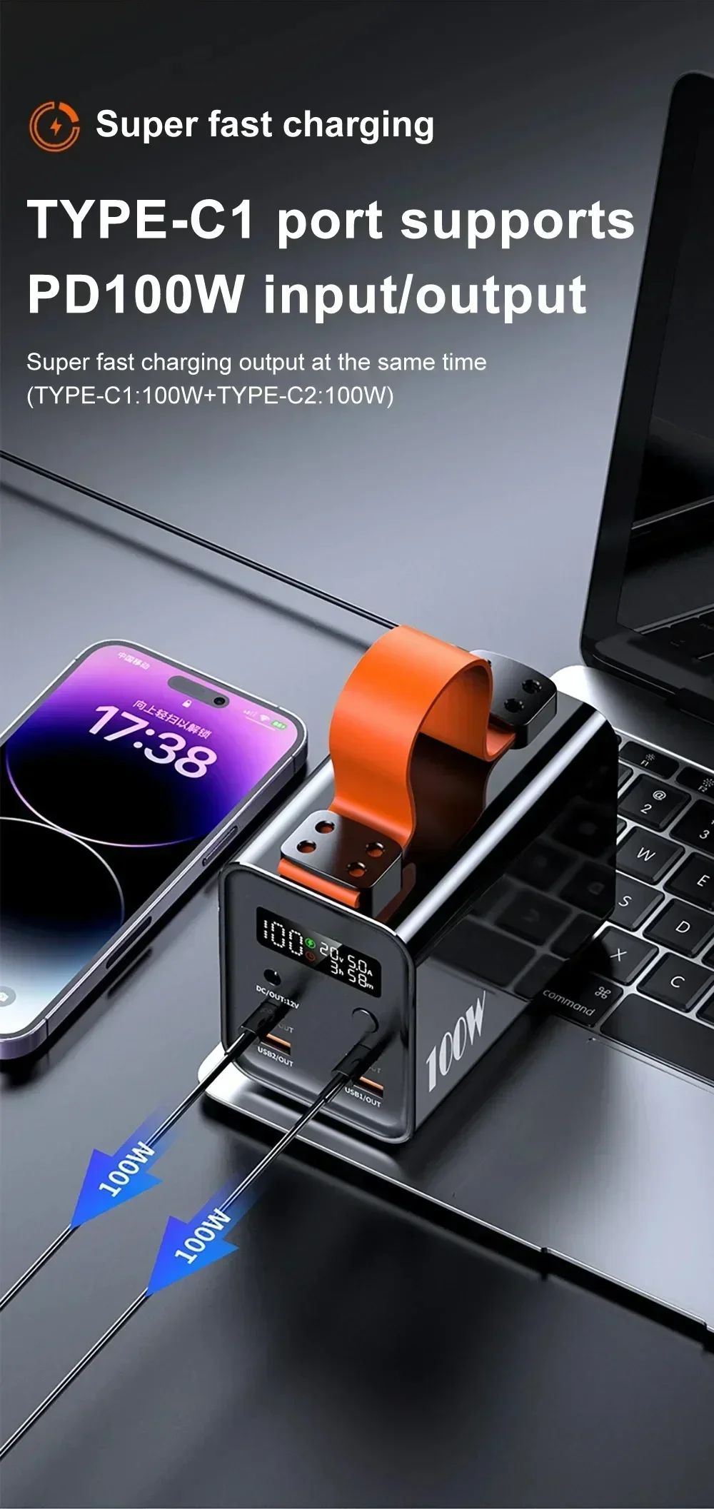 Compact & Portable Design:At just 1.2kg with a sleek 116*72*94mm size, this power bank is designed for on-the-go convenience. Power Bank 100w|Power Bank 100w Fast Charging|High Capacity Power Bank:Equipped with a massive 60000mAh capacity, this power bank ensures long-lasting power for your devices. USB C Fast Charging Technology:Features USB C fast charging, allowing for quick power-ups of your iPhone 15 or Samsung devices. Digital Display & LED Lamp:Boasts a digital display and LED lamp for easy monitoring of power levels and lighting in low-light situations. Multi-Port Output:With dual USB and DC outputs, this power bank provides versatile charging options for various devices