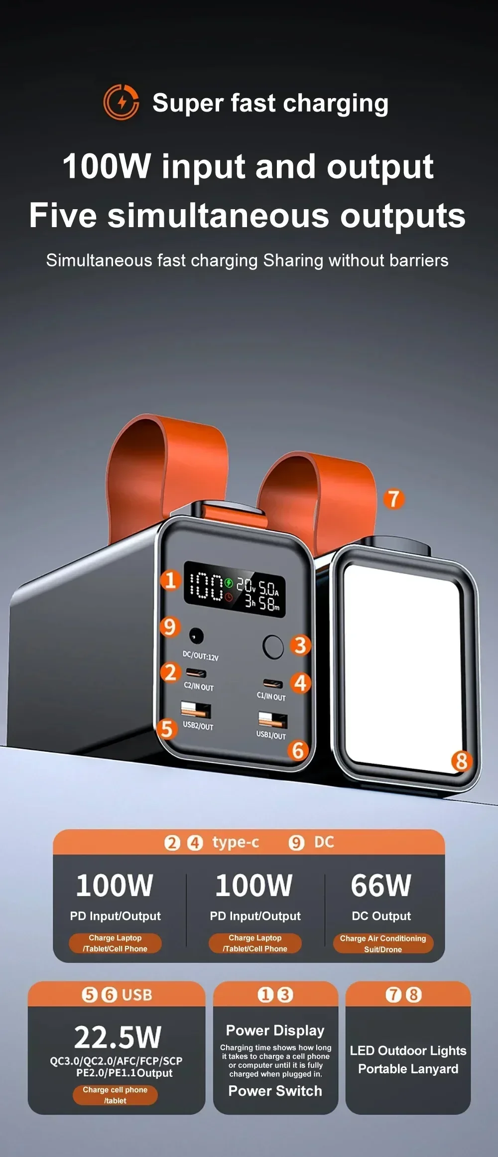 Note: Single port Type-C 1&2 input/output 100W, double port Type-C 1&2 simultaneous use 80W+80W(160W). Single port input fast charging, multiple ports simultaneous use is 5V/3.0A