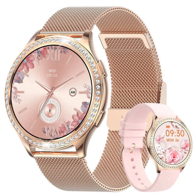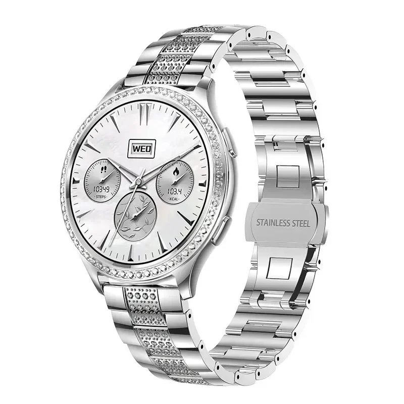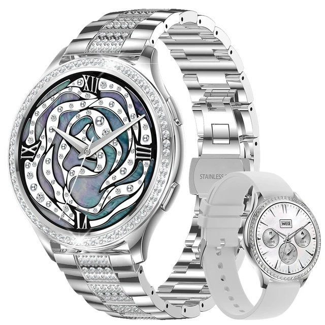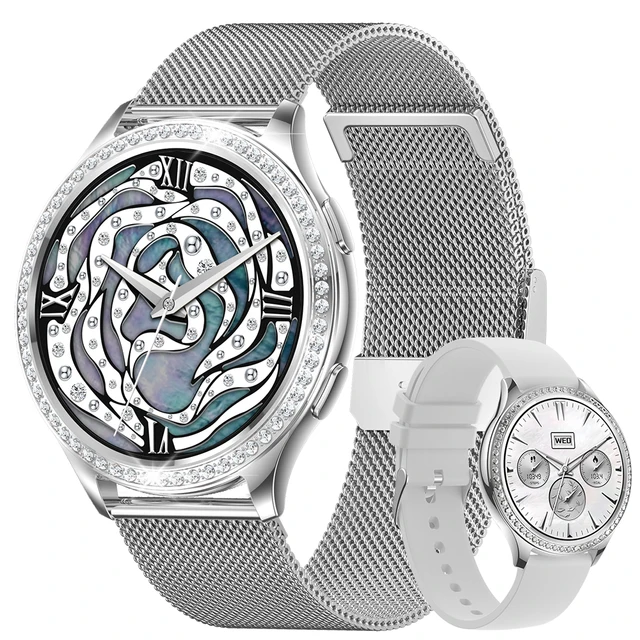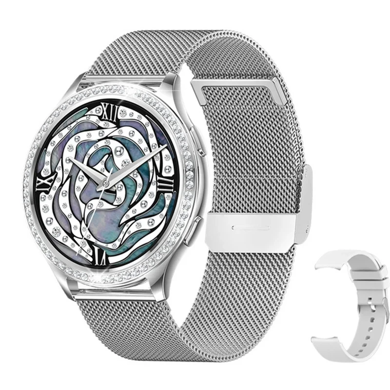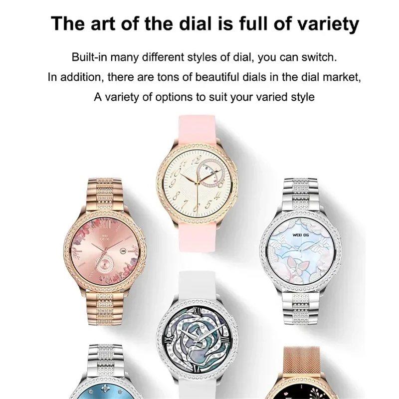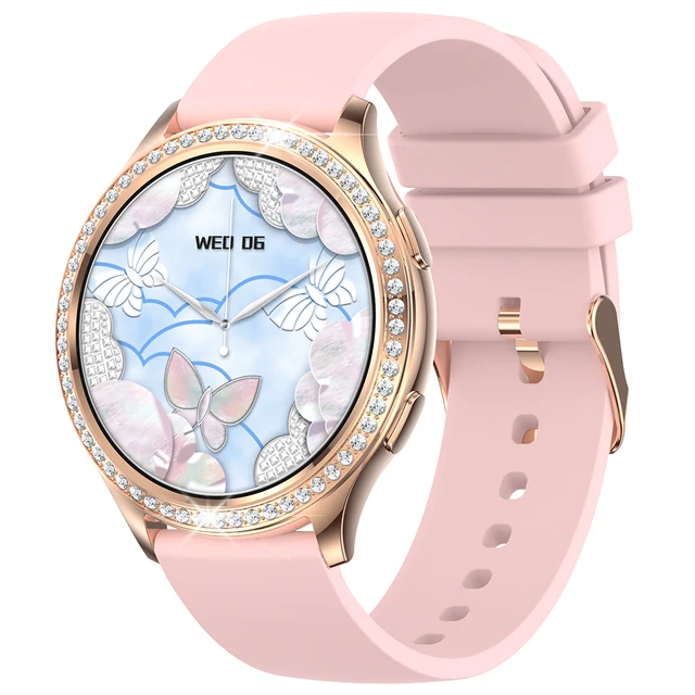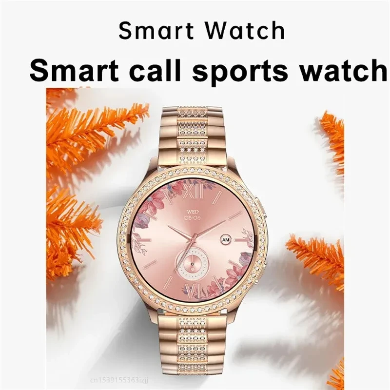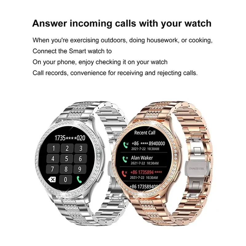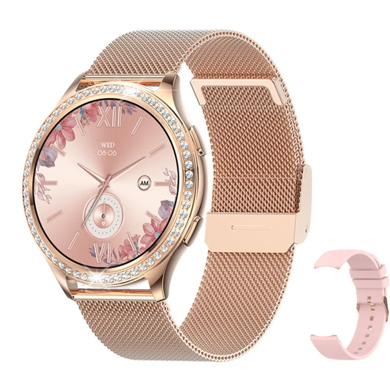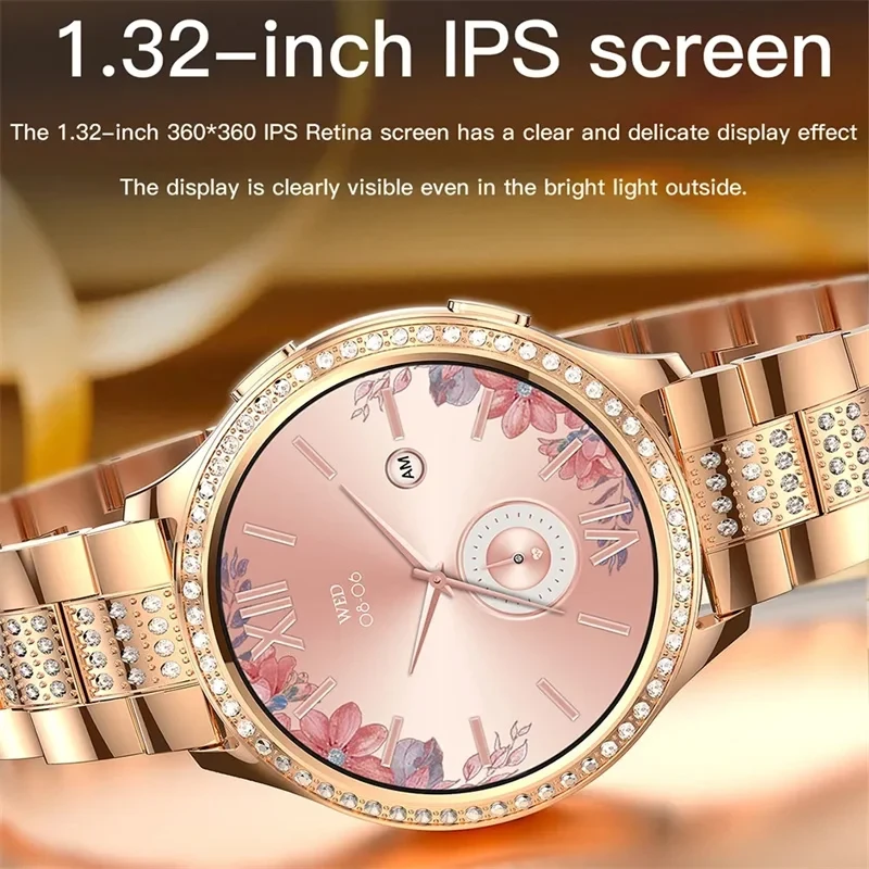 Diamond case, 1.32" 360*360 HD full touch screen, female physiological health, one-touch connection, red light 24-hour true blood oxygen, heart rate, message push, pedometer, music player, Bluetooth call, call log, contact, phone dial, sedentary reminder (APP), sleep monitoring, remote photo, weather forecast, voice assistant, 100+ sports modes, health monitoring, custom Dial, IP67 waterproof