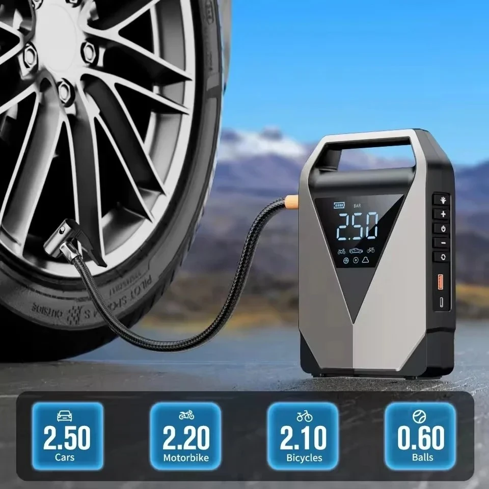 (1) Please make sure the product power is over 75%, which can achieve the best starting performance; As the power decreases, the starting performance will also decline. ![]() 1. The built-in 8,000 mAh high-rated lithium polymer battery can provide a peak current of 2,500A and support starting 12V cars with a displacement up to 8.0L Giesel and 6.0L Diesel engine. With fully charged, it can start the car for more than 20 times! ![]() 2. Portable air compressor has a maximum pressure of 150 PSI with an air flow of 25L/min! Only 4 minutes can fully inflate a car tire (0-36PSI) or 30 seconds to refill a car tire in daily situations (28-35PSI). With a full charge, it can inflates 4 car tires from 0-36 PSI or 12 car tires from 28-36 PSI. ![]() 3. Default 4 inflation modes meet your various needs, accurate real-time figures monitoring, auto-stop when reaching the preset program value, free your hand and attention from over-inflating your tires! The reinforced rubber nylon made air hose has the trait of explosion-proof, freeze-proof & wear-resistant. ![]() 4. The product equipped with 3 Colors LED lighting with 3 modes: Flashlight, Strobe, SOS, which are useful in roadside emergencies at night. Never worry about finding stuffs, inflating in the dark, sending sign of warning, calling for help! ![]() 5. Works as a 5V/2A USB-A output power bank, meets your multiple emergent charging need for mobile phones, earphones, tablets, watches... Also, 5V/2A Type-C input gives a full charge to the product with 4-5 hours. ![]() 6. The upgraded intelligent clamp has a built-in protection system that provide up to series of protections both for the product and your car battery. Also remember to put on the silicon air hose cover to the connection head to avoid being burned by the heat raised by the compressor pressurization. ![]() 7. HD Large Digital LCD Screen Display makes every indicator and figures clear to read; Simple buttons and compact size are friendly to all ages to operate. PC/ABS material shell make it strong and resistant to use even in -20℃- 60℃ extreme weather! ![]() ALL IN ONE STORAGE BAG ![]() |