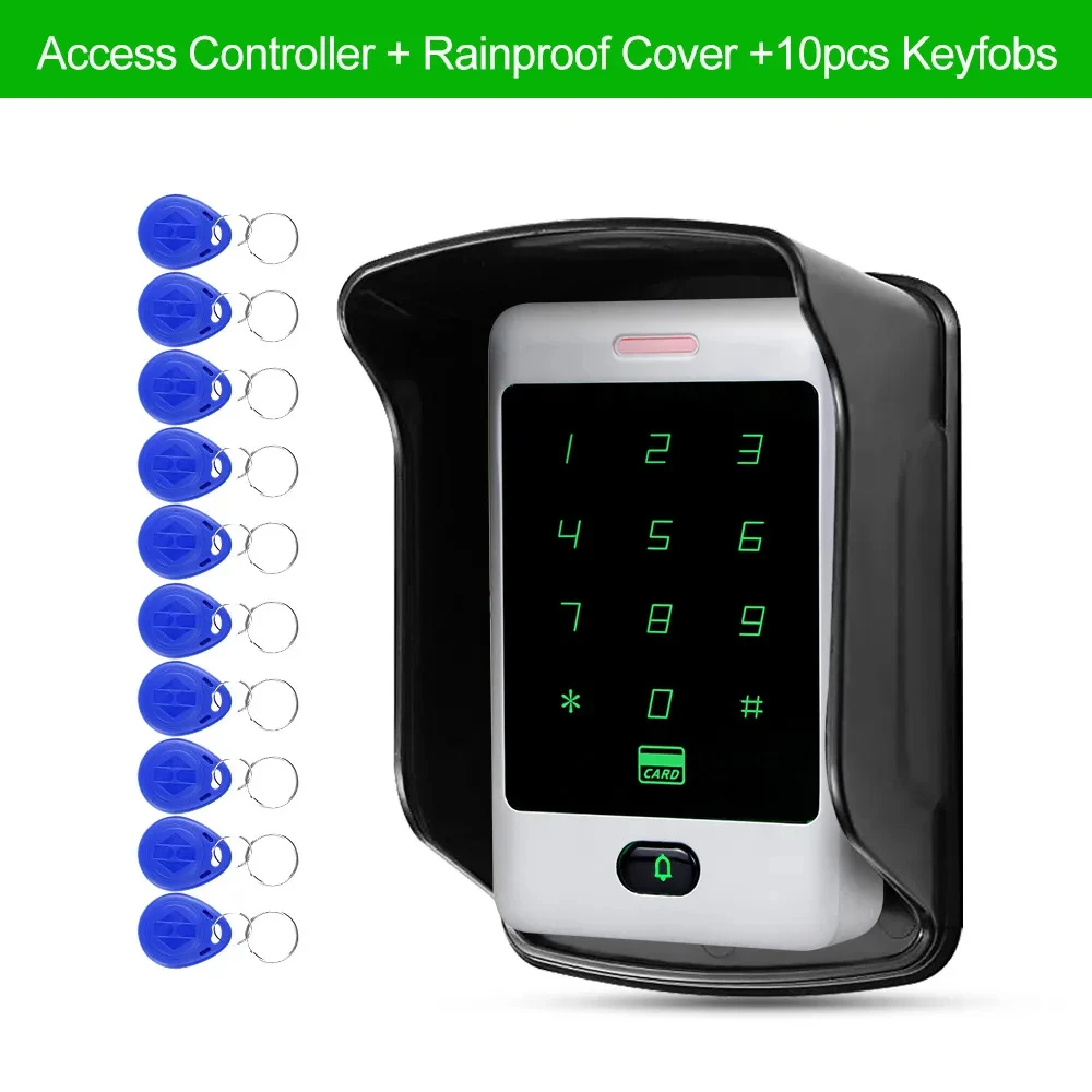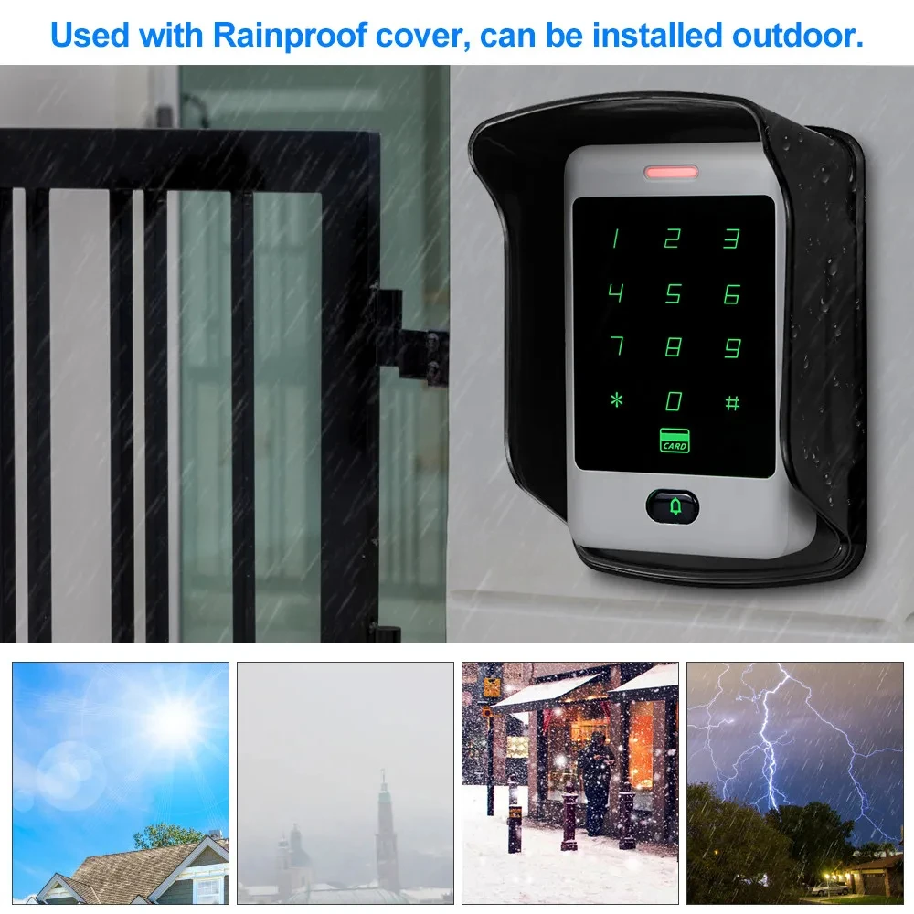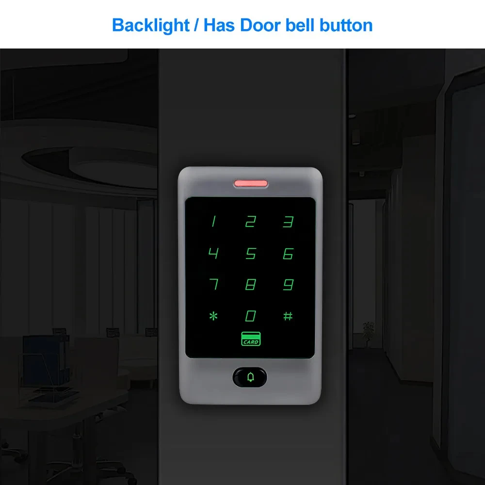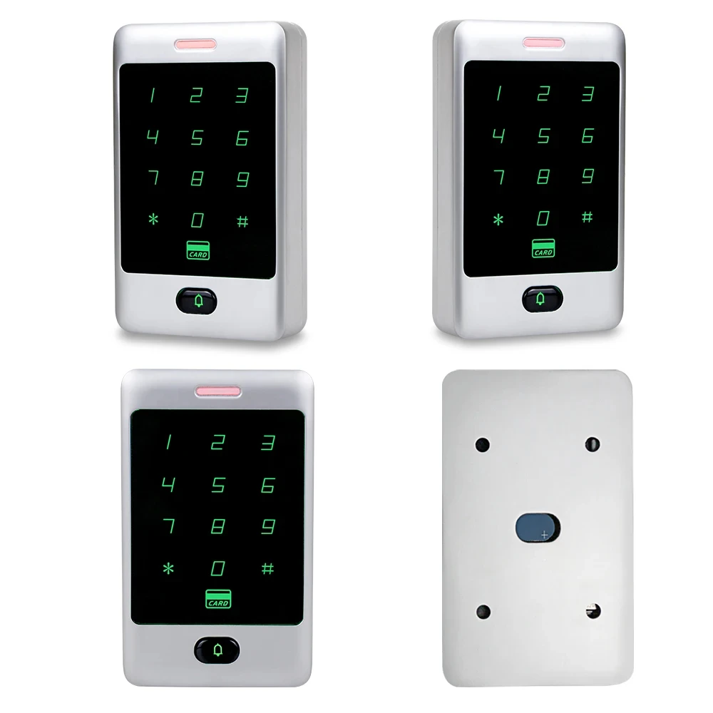RFID Standalone Touch Metal Access Control With 10 Keychains 125KHz ID Waterproof Cover For Door Access Control System 8000 user Programming Video 125KHz RFID Standalone Access Control Keypad High quality / 8000 users capacity / 3 unlock methods Product Features 1) All-metal case design(zinc alloy). Organic glass panel (Acrylic touch screen). 2) 8000 users capacity for storing and reading to provide a powerful security, the high-grade built-in microprocessor 3) with strong anti-interference ability, high safety and reliability. 4) Support Data copy and backup between the same series of access control. 5) Circumscribed humanized tamper alarm function. 6) Can be used as card reader or standalone access controller. 7) External Wiggins dummy: WG26/34 input and output. 8) Can set up management cards (Deleted card and added card). 9) Active and passive lock signal output. 10) Imported double point relay output signal port. 11) Support three unlock method : password, RFID card, RFID card +password. 12) Extending function: external memory, tamper alarm, extended voice etc. 13) Has green backlight, can be see clear digit number even at dark. 14) Has a door bell button Product Specification