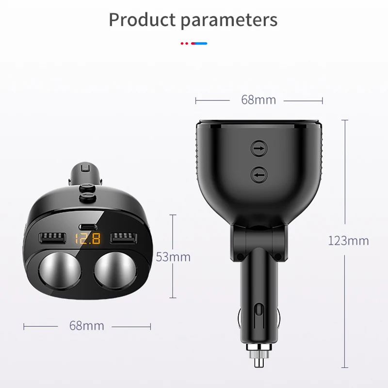 Product Specification: Product Name: Car Nigarette Lighter Charger Colour: Black Material: ABS+Metal Size: 12.3 x 6.8x5.3 cm Weight: 59g Input Voltage: DC12-24V Power: 80W Output Current: 3.1A ( Max ) Features: 1. 2 cigarette lighter socket; 2 USB ports, 1 Type C charging; 2. 180 degree rotation; Digital voltage display; 3. Overload protection design, safer to use. 4. Independent switch control, turn on and off freely. Note: 1. The pictures are for reference only. The actual product shall prevail. Thanks a lot!