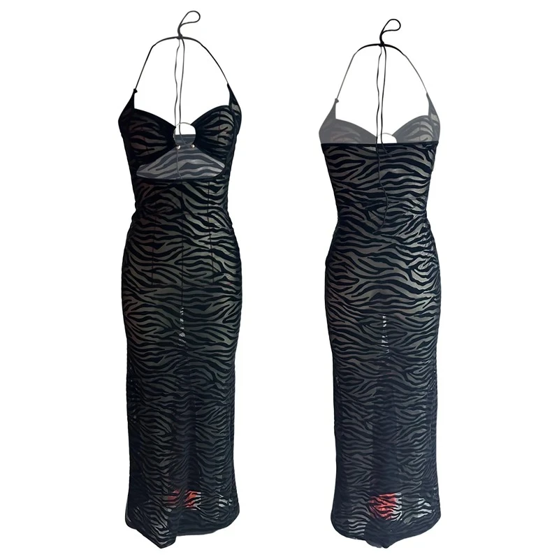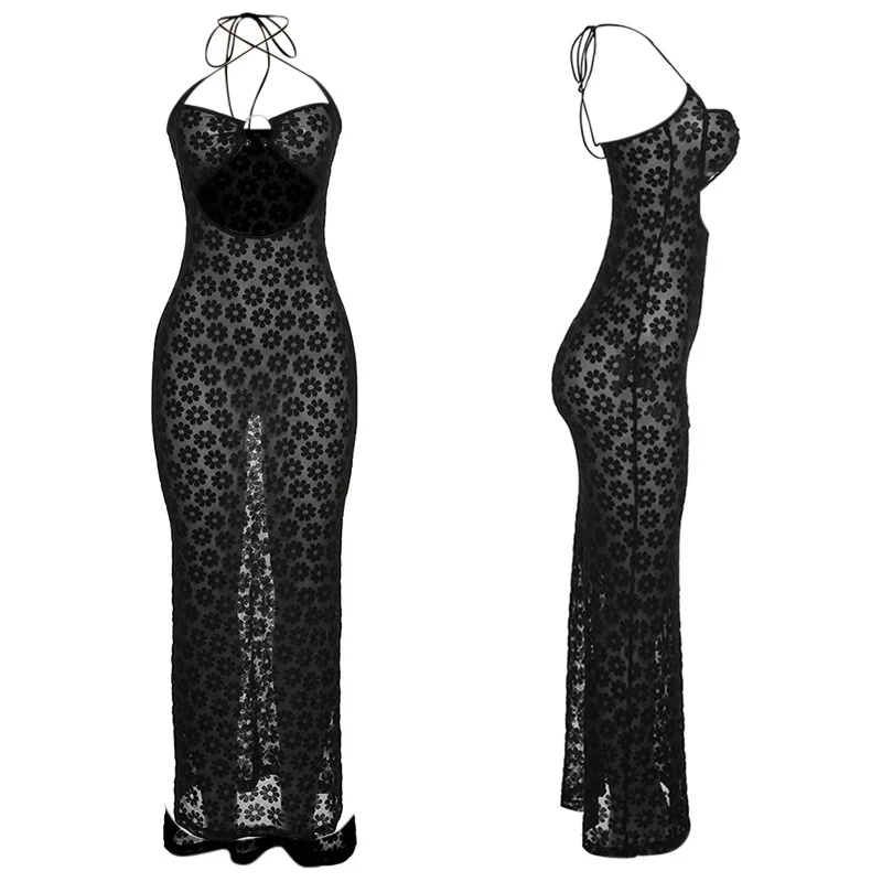 See-Through Cutout Halter Neck Long Dress Womens Sexy Backless Sheer Bodycon Party Dresses for Cocktail Club Gown Vestidos
