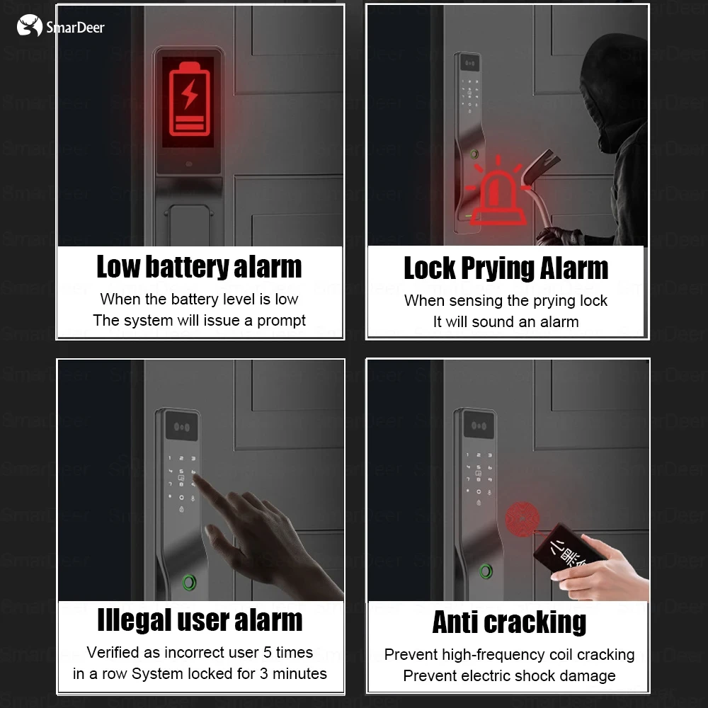 The smart door lock has multiple alarm modes such as pry lock alarm, incorrect fingerprint, incorrect password, and low battery alarm. The anti-theft system can prevent high-frequency electromagnetic interference.