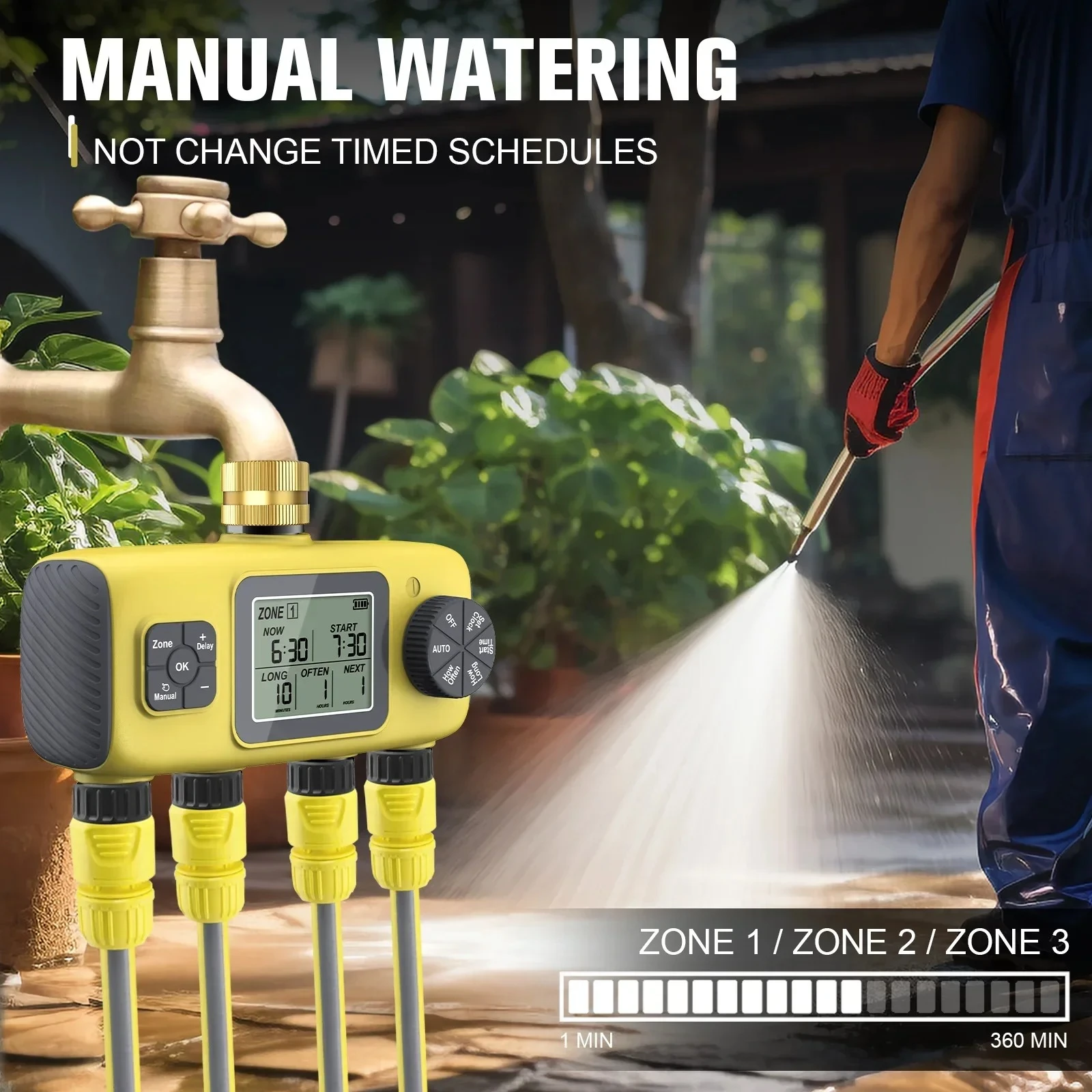 Feature: Upgrade your garden care with Garden Watering Timer, featuring dual programmable zones, automatic watering, rain delay mode, and three manual watering modes. With a durable design, easy-to-read LED display, and low battery alert, enjoy worry-free garden maintenance. 🌱 Efficient Watering Control: Experience precise control over your watering schedule with the 1/2/3 Outlets Separate Automatic Watering Timer. Each outlet boasts a maximum flow rate of 35 liters per minute, ensuring efficient and thorough watering for your lawn, garden, and plants. 🌱 Customizable Watering Durations and Intervals: Tailor your watering routine to perfection. This sprinkler timer allows you to set watering durations ranging from 1 minute to 5 hours 59 minutes for each of the 2 zones. Moreover, you can adjust the cycle watering interval to occur every 1 to 15 days or on specific days of the week from Monday to Sunday. 🌱 6 Programs for Versatile Watering:Optimize your watering routine with the 4 Outlets Separate Automatic Watering Timer's 6 programs designed for 2 independent zones. This innovative timer allows you to create 3 distinct plans, such as P1 for morning watering, P2 for afternoon watering, and P3 for evening watering, tailored to your plants' specific needs at different times of the day. With flexible control over watering time and frequency for each outlet, you can ensure that your lawn, garden, and plants receive the perfect amount of hydration throughout the day. 🌱 Manual Watering Mode: Need to give your plants extra attention? The manual watering mode comes in handy, allowing you to manually control watering times from 1 to 59 minutes per outlet. Once manual watering is complete, the timer seamlessly switches back to Auto mode, ensuring your preset schedule continues uninterrupted. 🌱 Rain Delay Functionality:Stay water-wise with the rain delay mode. This feature lets you postpone watering for 1 to15 days based on local rainfall, preventing unnecessary watering during wet conditions. It automatically reverts to your scheduled watering plan afterward, helping conserve water and reduce water costs. 🌱 Durable and Easy to Install:Designed for durability, this watering timer is IP55 waterproof rated and comes with sealing washers and threaded sealing tape for each outlet to prevent leaks. Installing is a breeze thanks to the 360° rotatable interface, and it can withstand high water pressure from 7.25psi to 116psi, ensuring stable water flow and minimal interference. 🌱 User-Friendly Features:The timer features a 2.5-inch LCD display with a low battery reminder for easy monitoring. Specification: 🌱 Snecifications00H01M~23H59M 🌱 Connection Size: 3/4"External Thread. 🌱 Material:ABS + Anti-UV Silicone material. 🌱 Power by:4 xAA alkaline batteries (battery Not included). 🌱 Control type:1/2/3/4-Way independent control. 🌱 Water Duration:Sunday to Saturday/ 1 days to 15days 🌱 Waterproof:IP55. 🌱 Working Pressure:0.05-0.8Mpa(7.25psi-116psi) 🌱Working Temperature:40.1°F-113°F(4.5°C-45°C) Package Contains: 1 x Water Timer 1 x User guide 1 x Package Box ![]() ![]() ![]() ![]() ![]() |