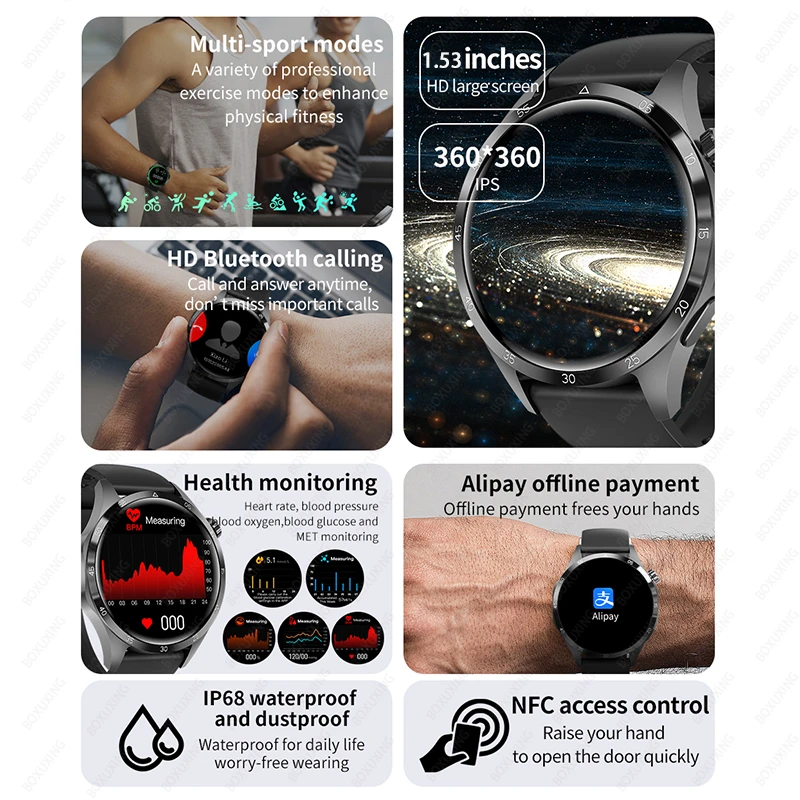 This product has many handy functions! For example, with the NFC function, you can open the door with the watch! Bluetooth calling function, after connecting the Bluetooth of the mobile phone, you can make calls directly! AI voice assistant function, open the function of the watch through voice! There are also some medical functions to monitor heart rate, blood pressure, and keep an eye on your health! All are handy functions! screen size:1.53 inches Waterproof Level: IP68 Lifetime: About 5-7 days of use and 30 days of standby Resolution:360*360 Battery capacity:300mAh APP: RDFit Charging Method: Wireless charging Compatible System: Android 4.4 or above, IOS 9.0 or above Features: High-definition Bluetooth Call, compass, off-screen pointer, cover hand off screen, custom picture, APP background download picture, QR code (download and connection two-in-one), find mobile phone, calendar, motion track, restart, message push, remote Camera, Alipay, sleep monitoring,altitude, body temperature monitoring, weather, blood pressure, voice assistant, my QR code, button definition settings, blood oxygen, breathing, dial, pedometer, timer, menu style, factory reset, Settings (Smart Island, Drainage, Power Saving Mode, Screen Off Time, Raising Wrist to Brighten Screen, NFC, Brightness, Button Definition, Vibration Intensity, Do Not Disturb Mode, Password Settings, Language, Time and Date Settings, Connecting to APP, Factory Reset, Restart , Power Off, About), Phone (Contacts, Call History, Dialpad, Call Settings, Emergency Call), Calculator, Heart Rate, Language Selection, About Watch Information, Alarm Clock, Sports Mode, Bluetooth Music, Bluetooth Calls, Stopwatch, Off Screen time, vibration intensity, time and date setting, password lock. Drop-down menu: Bluetooth switch, do not disturb mode, brightness adjustment, one-key lock screen, weather, shutdown, payment code, Douyin, Alipay, always-on setting, NFC, settings, alarm clock, vibration switch, menu style, factory reset. Swipe up menu: message push. Swipe right: split screen (weather, sleep, heart rate, blood pressure, blood oxygen, music, common applications). Swipe left: Add applets (heart rate, blood pressure, sleep monitoring, blood oxygen, exhalation training, step counting, weather, music, body temperature monitoring). Watch supported languages: 1. Chinese, 2. English, 3. Russian, 4. Spanish, 5. German, 6. Italian, 7. French, 8. Portuguese, 9. Polish, 10. Dutch, 11. Greek, 12. Turkish, 13. Romanian, 14. Japanese, 15. Chinese Traditional Chinese, 16. Hebrew, 17. Czech, 18. Slovak, 19. Hungarian, 20. Arabic, 21. Indonesian, 22. Korean, 23. Vietnamese, 24. Thai, 25. Persian, 26. Ukrainian, 27. Malay, 28. Burmese Package: smart watch*1 charging cable*1 user manual*1 original box*1