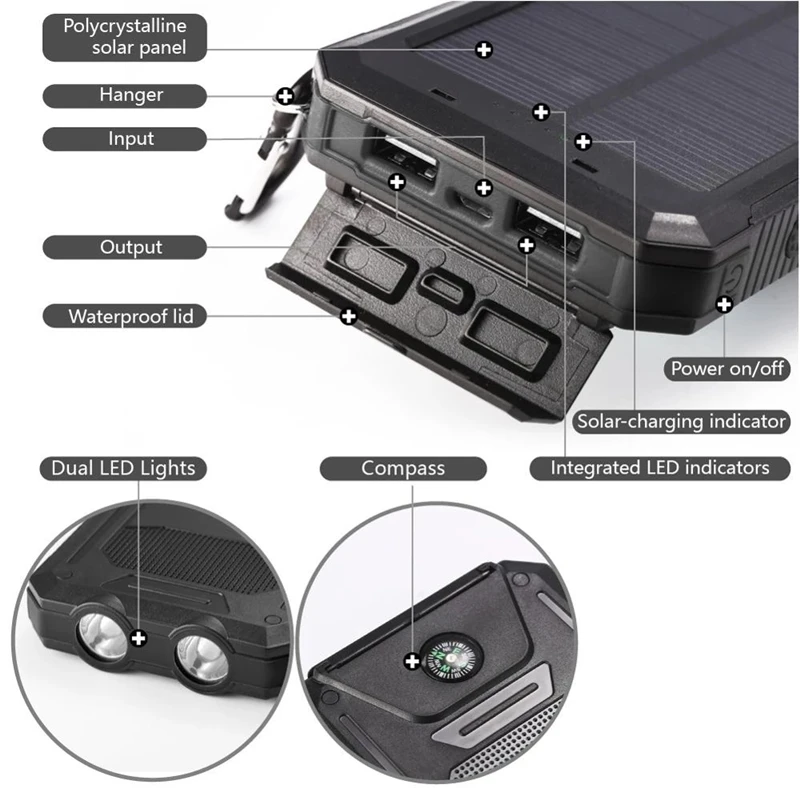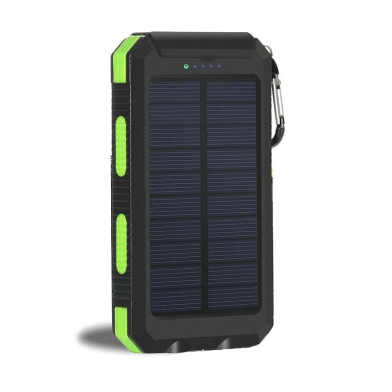 Specification: Product Name: Waterproof Solar Power bank Capacity:10000mAh/20000mAh Input: DC 5V/2A Output: 5V/1A or 5V/2.1A Color: Black orange, Black blue, black, Black green Suit for: for ipad, for iphone, for other brands of mobile phones, for PSP, MP3, MP4 and other digital products Package Inlcudes: 1 * Solar Powerbank 1 * USB Cable 1 * Carabiner 1 * Retail Box 1 * User Manual