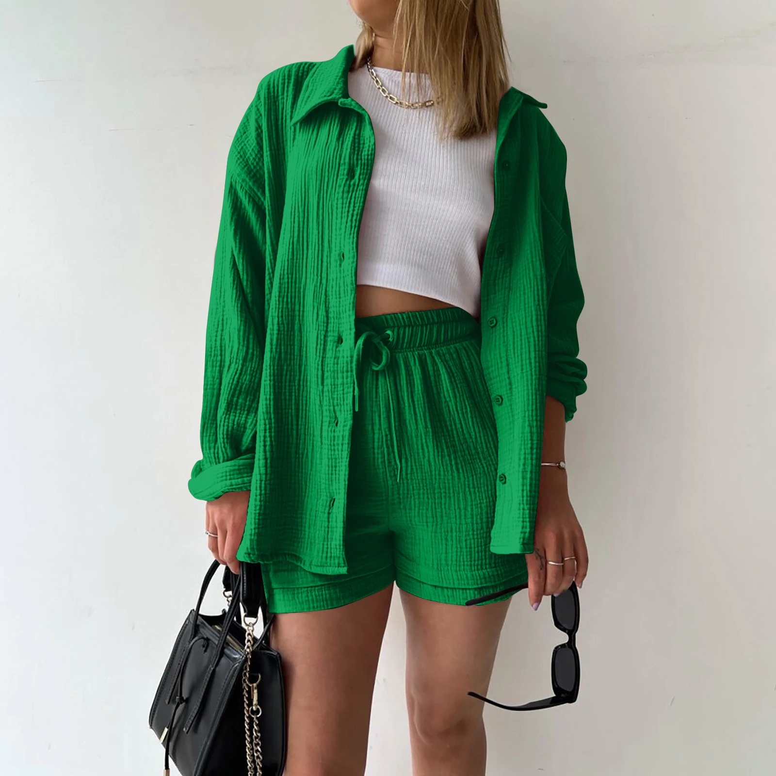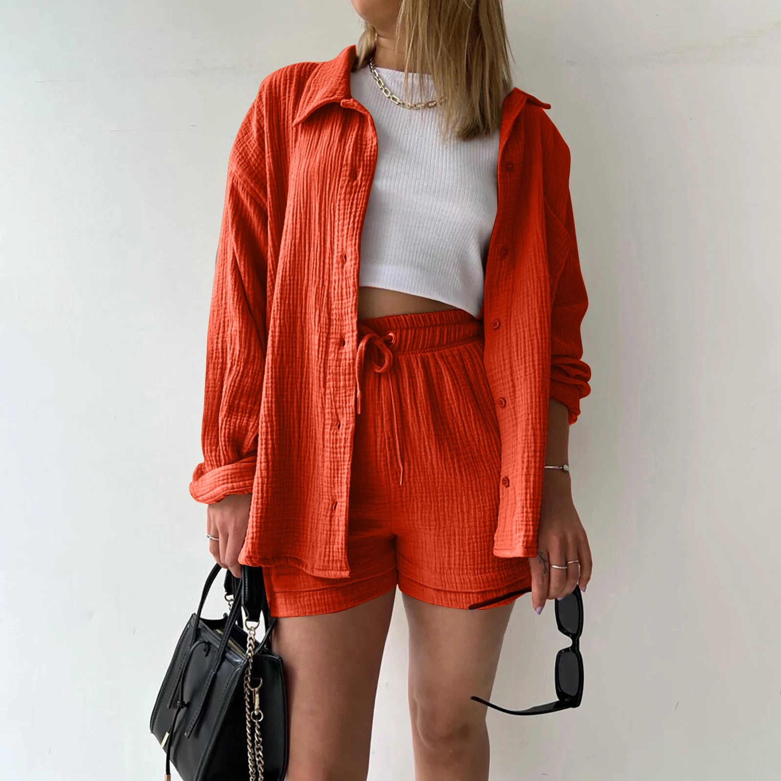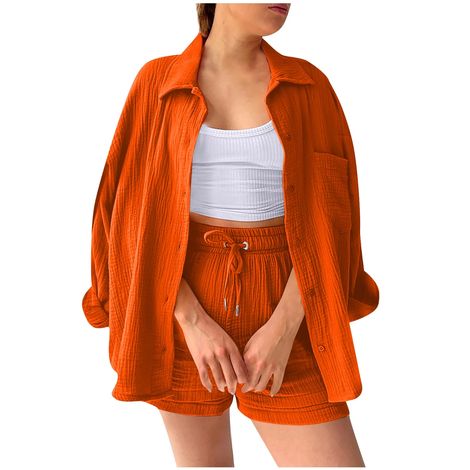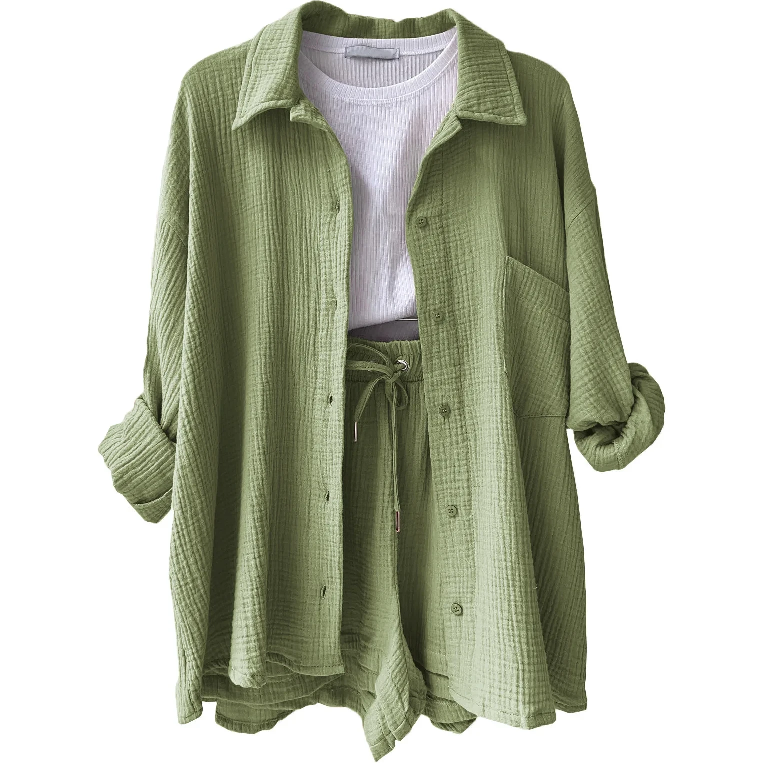 Two Piece Women's Summer Muslin Blouse Shirt And Shorts Clothes Two Piece Set Beach Outfit Set Two Piece Set WomenWomen 2 Piece Wrinkle Collar Long Sleeve Shirt Outfits Button Down Blouse and High Waist Drawstring Shorts Sweatsuit Set Feature: