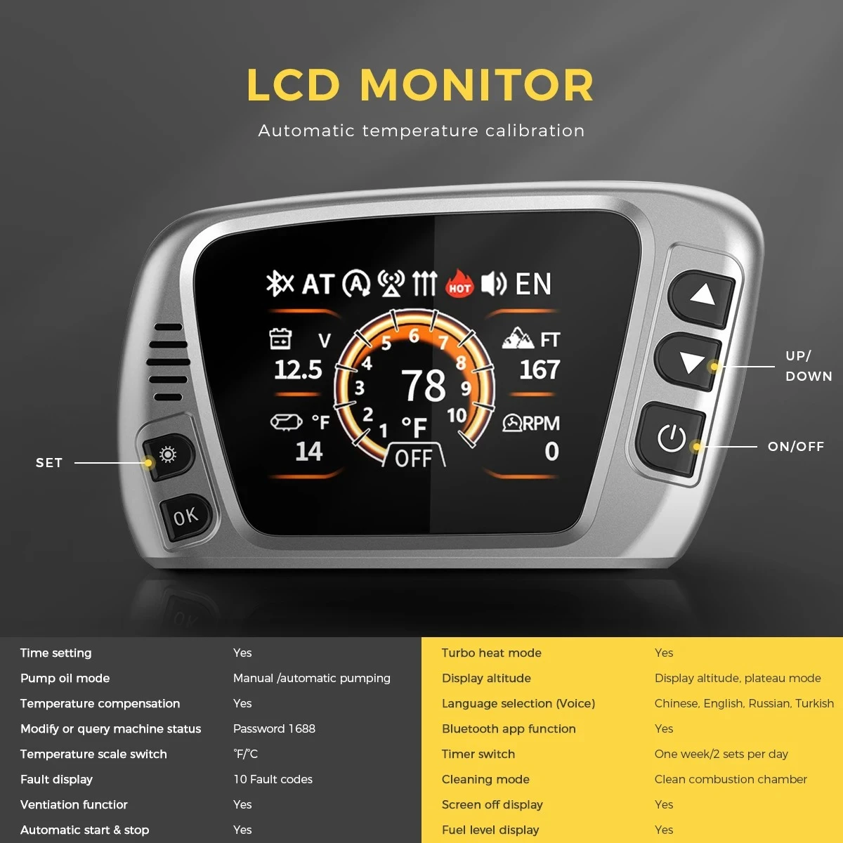 Three Control Methods:Our upgraded diesel heater comes with Bluetooth control, you cancontrol the heater to preheat or regulate the temperature within a distance of 98 feet/30 metersby simply downloading the app. lt also comes with a remote control and LCD display so you canchoose the control that's right for you. The temperature adjustment range is 46 °F-95 °F/8 °C-35°C to meet your different needs.