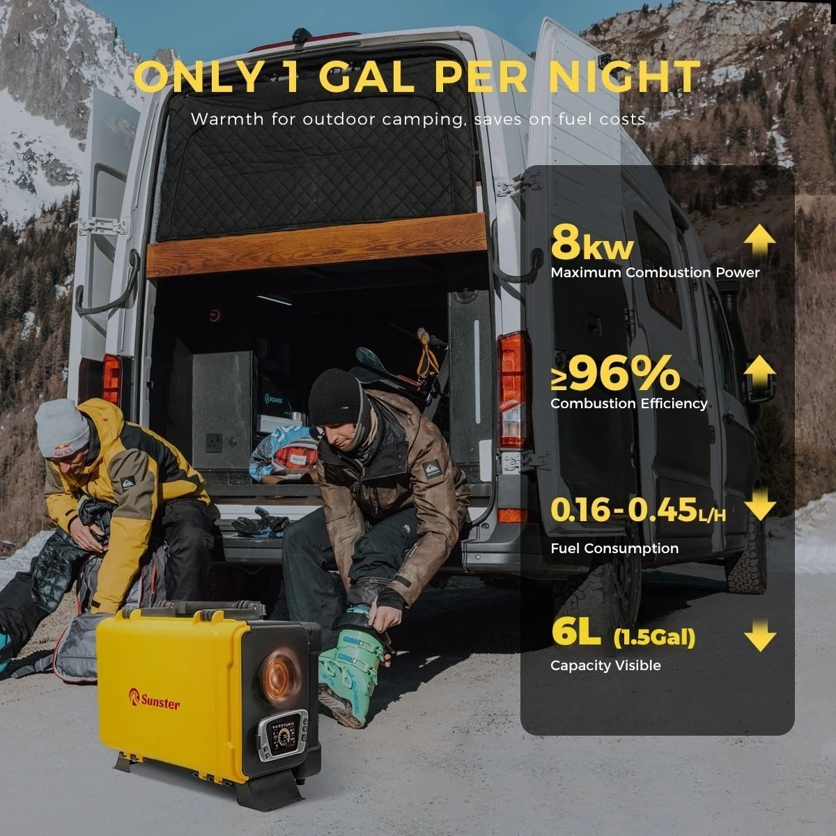 Low Fuel Consumption&Low Noise:Our diesel heater has a power of 8kw with a heating efficiency of ≥90%. lt consumes only 1 GAL of diesel per night to keep a large area of 215ft²/20㎡ continuously warm. it features built in inteligent thermostat control and Upgrade the ultra quiet oil pump for low noise <35dB, ensuring a comforable sleep in RVs and outdoor camping without being disturbed by the cold.