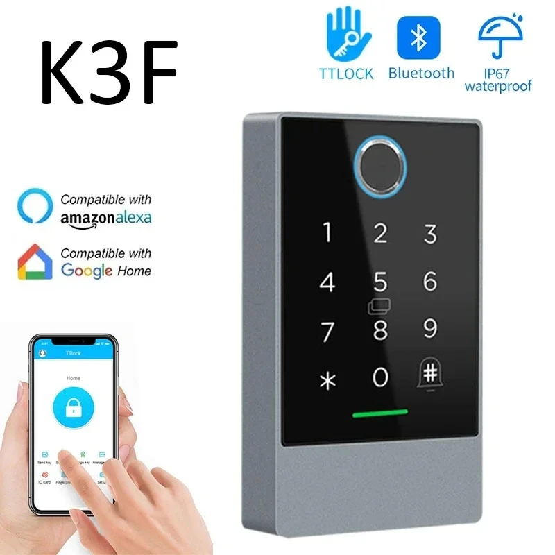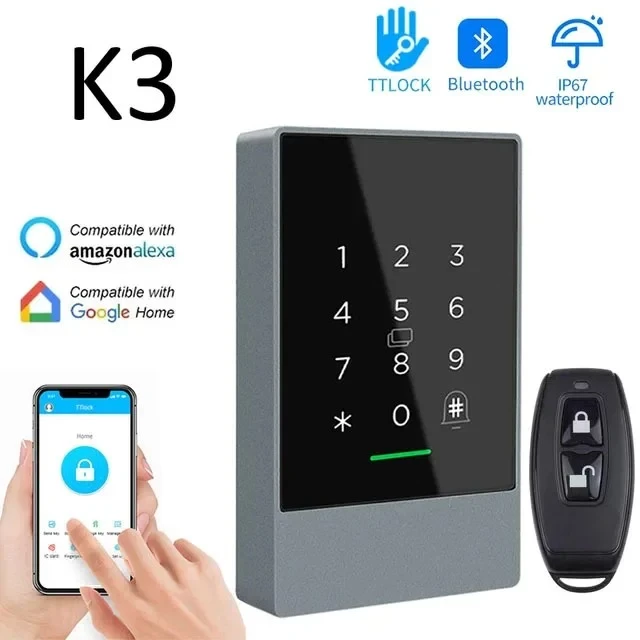 If you require remote control, you need to purchase G2 ttlock Bluetooth gateway for WiFi connection. Product Features: 1. Unlocking :App+ Password+card 2. App management,password are generated from app and can be setted to limited by time 3. Date starage in cloud service User can be added or deleted remotely 4 Attendace records can be checked remotely History can be checked remotely 5. One app can manage many systems Easy to upgradte from normal door access system to bluetooth smart door access system 6. Share eKeys via APP with different levels of authorization. 7 Keypad protection:Keypad is locked for 5 minutes after 5 times entry of wrong passcode. Psuedo passcode:Key in any digits, the lock is unlocked if the last digits comprise of the real passcode. 8. Auto-lock:Auto lock within 5 seconds of unlocking. 9. Real time monitoring: Administrator receives a push notification when a user unlocks with App. Log in with a different mobile: When log in with a different mobile, the previous one logs out automatically. 10. Message notification: A message is pushed to the previous Administrator when the lock is reset. Product Specifications: Product Model: K3 (Normal Version)/K3F (FINGERPRINT VERSION) Dimensions: W80mm x H126mm x T19mm Material: ABS/Acrylic Panel Support system: Android 4.3/I0S7.0 Above Standby Current: K3/K3F 28MA (backlight on) Operating Current: ≈1A Power Supply: DC 12V WaterProof Grade: | P67 Card capacity: 2000 Number of passwords: 500 Fingerprint Capacity: 100 (K3F only)