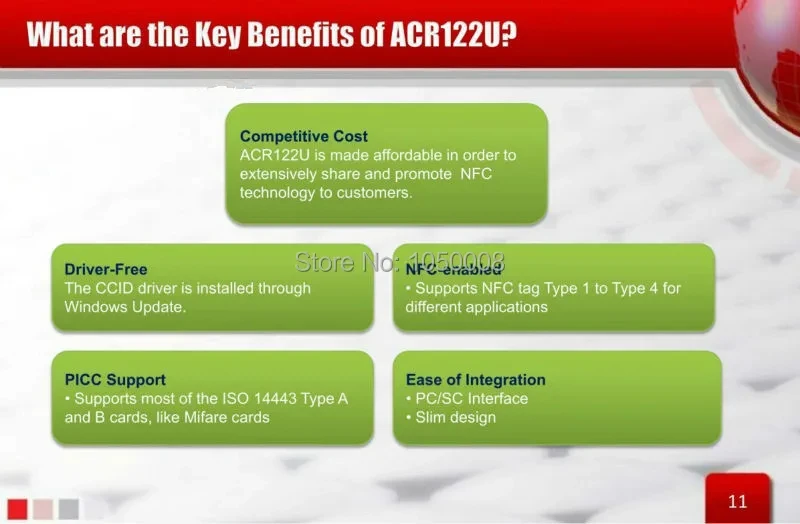PRODUCT DESCRIPTION The ACR122U is a PC-linked contactless smart card reader/writer developed based on the 13.56 MHz Contactless (RFID) Technology. Compliant with the ISO/IEC18092 standard for Near Field Communication (NFC), it supports not only M1 and ISO 14443 A and B cards but also NFC and FeliCa contactless technologies. ACR122U is compliant with both CCID and PC/SC. Thus, it is a plug-and-play USB device allowing interoperability with different devices and applications. With an access speed of up to 424 kbps and a full USB speed of up to 12 Mbps, ACR122U can also read and write more quickly and efficiently. The proximity operating distance of ACR122U is up to 5 cm, depending on the type of contactless tag in use. In order to increase the security level, ACR122U can be integrated with an ISO 7816-3 SAM slot. Furthermore, the ACR122U NFC Reader is available in module form, permitting easy integration into bigger machines, such as POS terminals, physical access systems and vending machines. The is ideal for both secure personal identity verification and online micro-payment transactions. Other applications of the ACR122U include access control, e-payment, e-ticketing for events and mass transit, toll road fare collection and network authentication. Features: