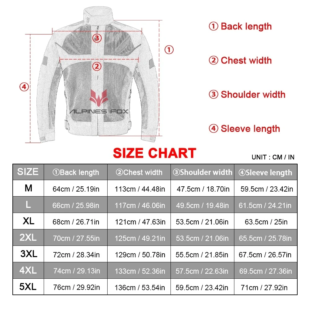 ![]() LYSCHY Men Motorcycle Jacket Summer Breathable Mesh Moto Jacket Protective Gear Motorcycle Coat Motorbike Clothing Jacket Black Note 1: Dear buyer, when you place order, please write your "height", "weight", "chest circumference "and "waist circumference"in the buyer remarks, or please leave us a message. if you choose a wrong size, we will advise a correct size for you, thanks!!! Note 2: Standard Asia Size is one size smaller than the European size, so when choosing the size, you can choose one size larger If your weight is over 100kg , have 5XL, please follow this link to buy: https://www.aliexpress.com/item/1005003686261040.html, thank you Size Charts (Unit: CM ) M: Back Length 64cm, Bust 113cm, Shoulder Width 47.5cm, Sleeve Length 59.5cm L: Back Length 66cm, Bust 117cm, Shoulder Width 49.5cm, Sleeve Length 61.5cm XL: Back Length 68cm, Bust 121cm, Shoulder width 51.5cm, sleeve length 63.5cm 2XL: Back Length 70cm, Bust 125cm, Shoulder width 53.5cm, sleeve length 65.5cm 3XL: Back Length 72cm, Bust 129cm, Shoulder width 55.5cm, sleeve length 67.5cm 4XL: Back Length 74cm, Bust 133cm, Shoulder width 57.5cm, sleeve length 69.5cm Product Information