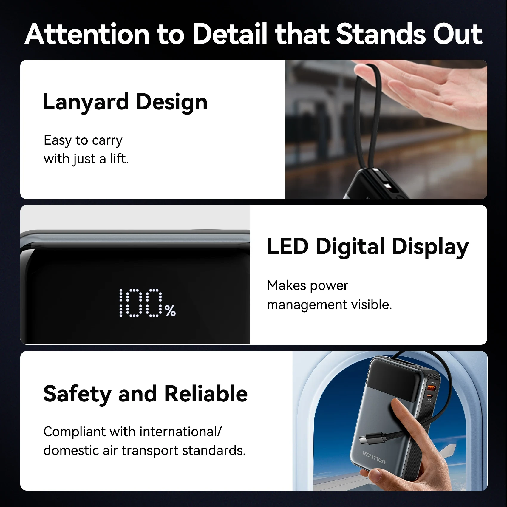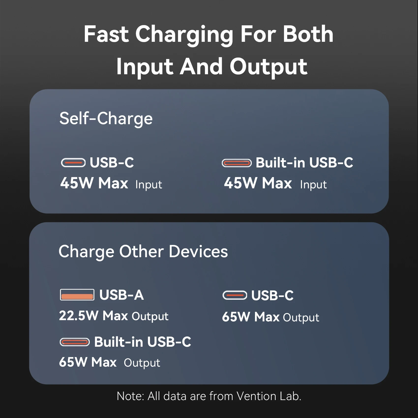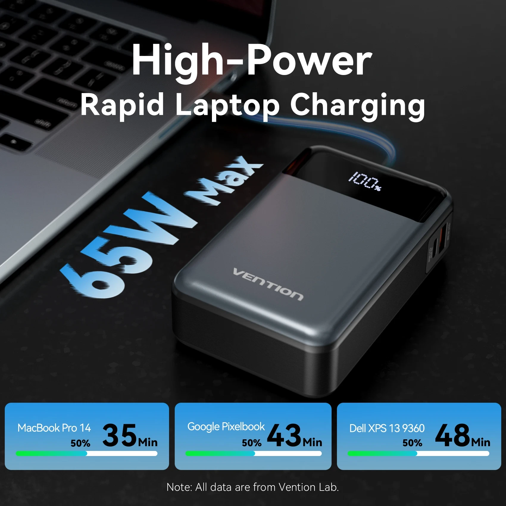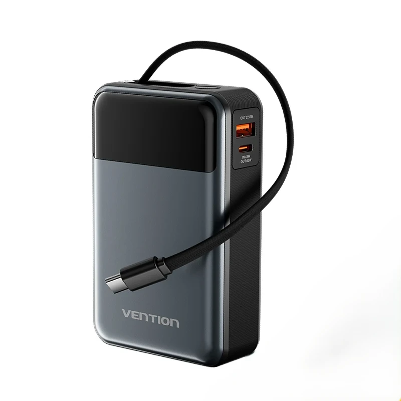 Shell Material: Durable PlasticnOutput Interface: USB-A, USB-Type CnFeatures: Built-in Cables, Digital Display, With LED LampnPower Bank Capacity: 20000mAhnSupport Quick Charge Technology: Two-way Quick ChargenVENTION Warranty: 12 Months Supportnnn|Vention Power Bank 65w|nn**Efficient and Portable Power Solution**nThe Vention 65W Power Bank is a reliable and versatile power solution for the modern individual on the go. This portable power bank, boasting a substantial 20000mAh capacity, is your ideal companion for all your electronic devices. With its built-in C cable, you'll never find yourself without a charging option for your mobile devices. The digital display keeps you informed of the remaining power, while the LED lamp serves as a helpful light source in low-light conditions. This Vention power bank is not only a powerhouse but also a stylish addition to your travel accessories.nn**Enhanced Charging Performance**nThe Vention 65W power bank is designed with the latest quick charging technology, capable of delivering fast and efficient power to your devices. The two-way quick charge feature allows you to charge both your power bank and your devices simultaneously. Whether you're on a long flight, a remote adventure, or just need a reliable backup for your daily commute, this power bank ensures that your devices stay charged and ready. Its lightweight build, at just 0.4 KG, makes it easy to carry in your bag or purse, making it an ideal travel companion.nn**Reliable and Long-Lasting Power**nCrafted with a high-quality Li-polymer battery, the Vention 65W power bank is engineered to last through all your adventures. With a 12-month warranty, you can rest assured that your investment is protected. Not only is the Vention power bank durable, but it also meets the safety requirements with its 105℃ emissions being below the threshold specified. This power bank is not just a product; it's a commitment to reliability and performance. Whether you're a professional on the move or a traveler seeking peace of mind, the Vention 65W power bank is the solution you've been looking for.