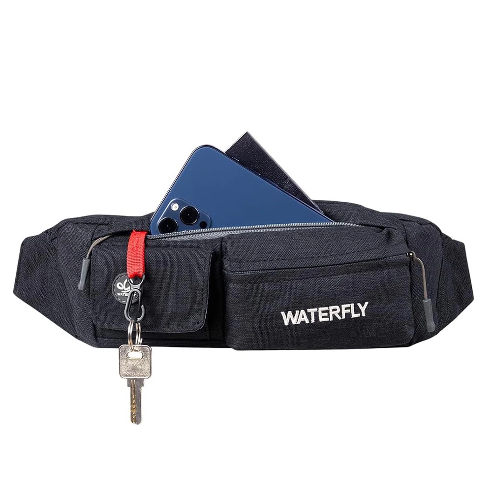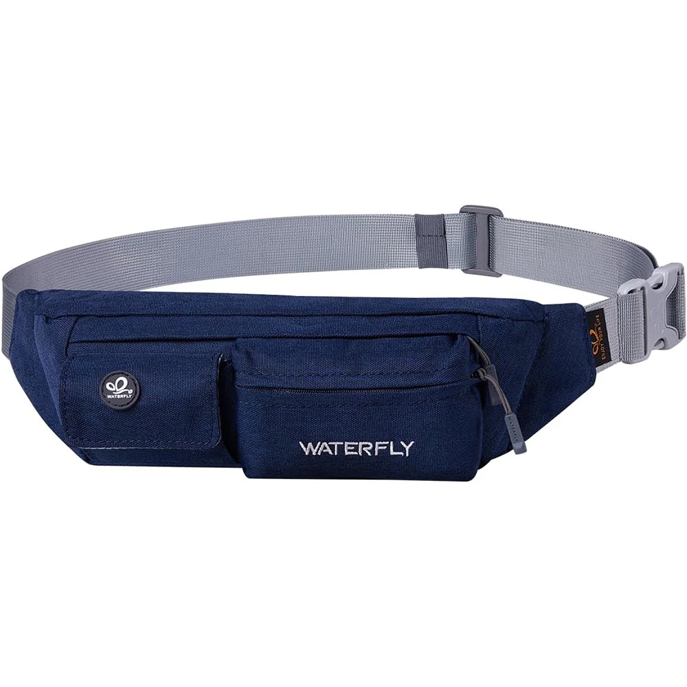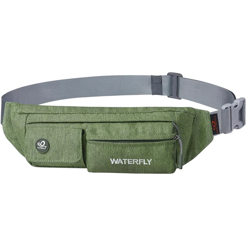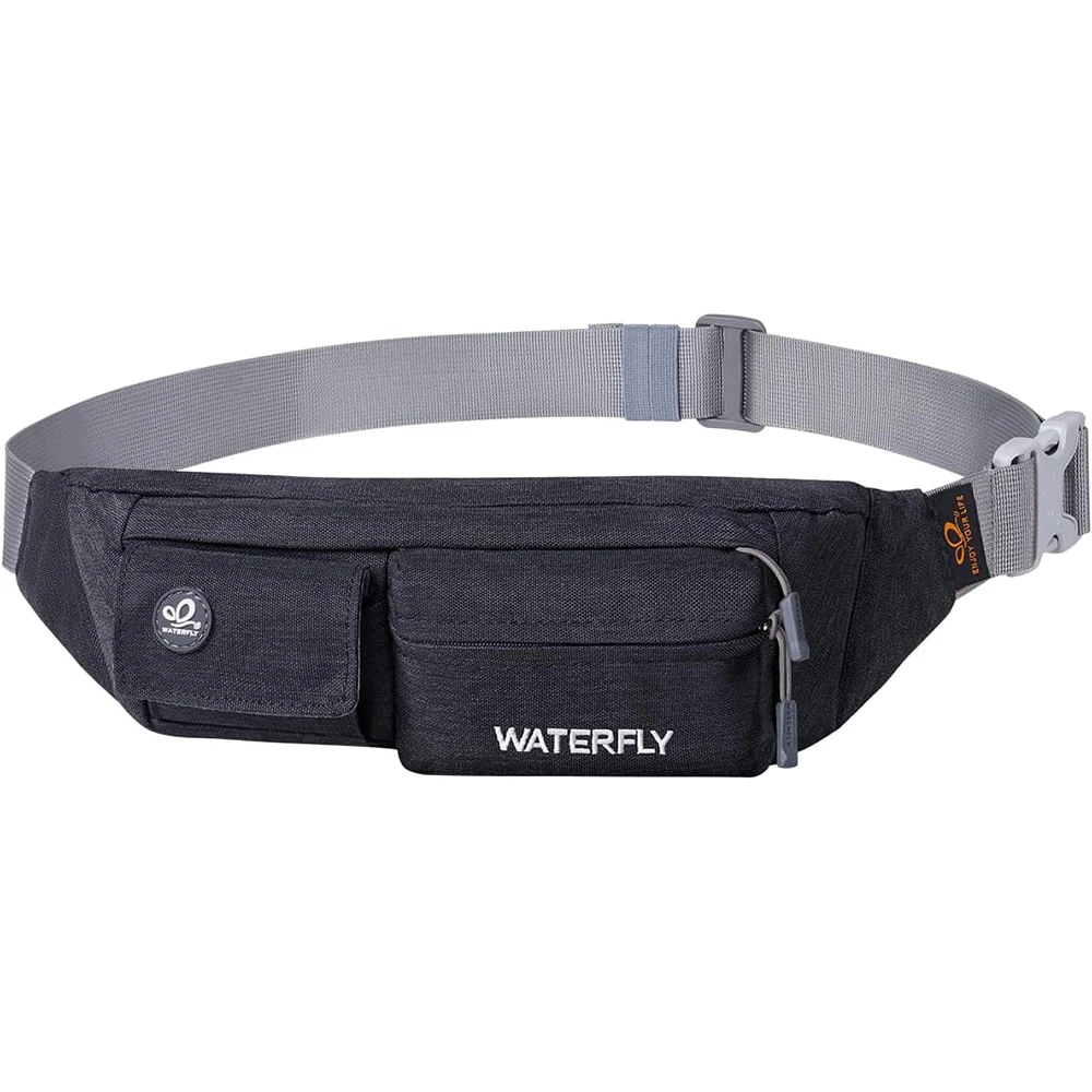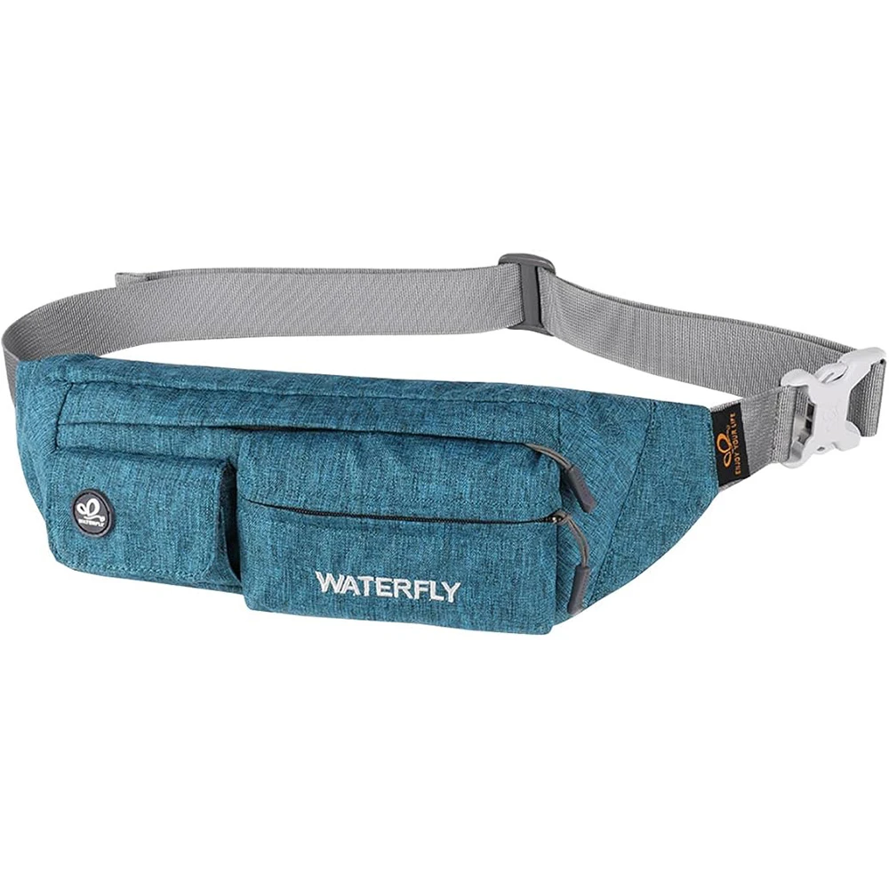 ightweight Compact Size: The slim fanny pack measures about 8"x2.5"x4.3" with only 5oz weight. You won't feel bulky when you wear it with all necessary stuff like phone, key, cards, cash and so on, suitable for running jogging dog walking biking hiking and other outdoor activities Multi Compartments And Anti Theft Pocket: There are 4 pockets on our fashion waist bag, including 3 front pockets and a hidden back anti theft pocket to store your passport or cash. The main compartment with a key hook is enough to store all phones under 6.5 inches Comfortable And Adjustable Belt: Waterfly belt bag with heavy duty soft nylon fabric is breathable and comfortable to wear. The fanny pack strap can be adjusted from 20~50", suitable for men women Water Resistant Fabric: The mini bum bag is water and sweat resistant. You don’t need to worry your stuff get wet anymore when you are outdoor or doing exercise in the gym. Please note do not immerse the hip bag into the water Different Styles To Wear: There are different ways to wear this stylish fanny pack. You can wear it on your waist, slant across your chest as a sling bag or hang it over the shoulder to match your wear