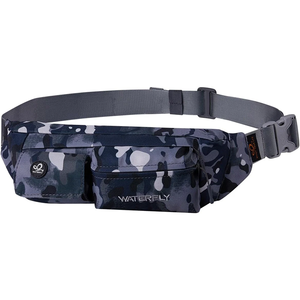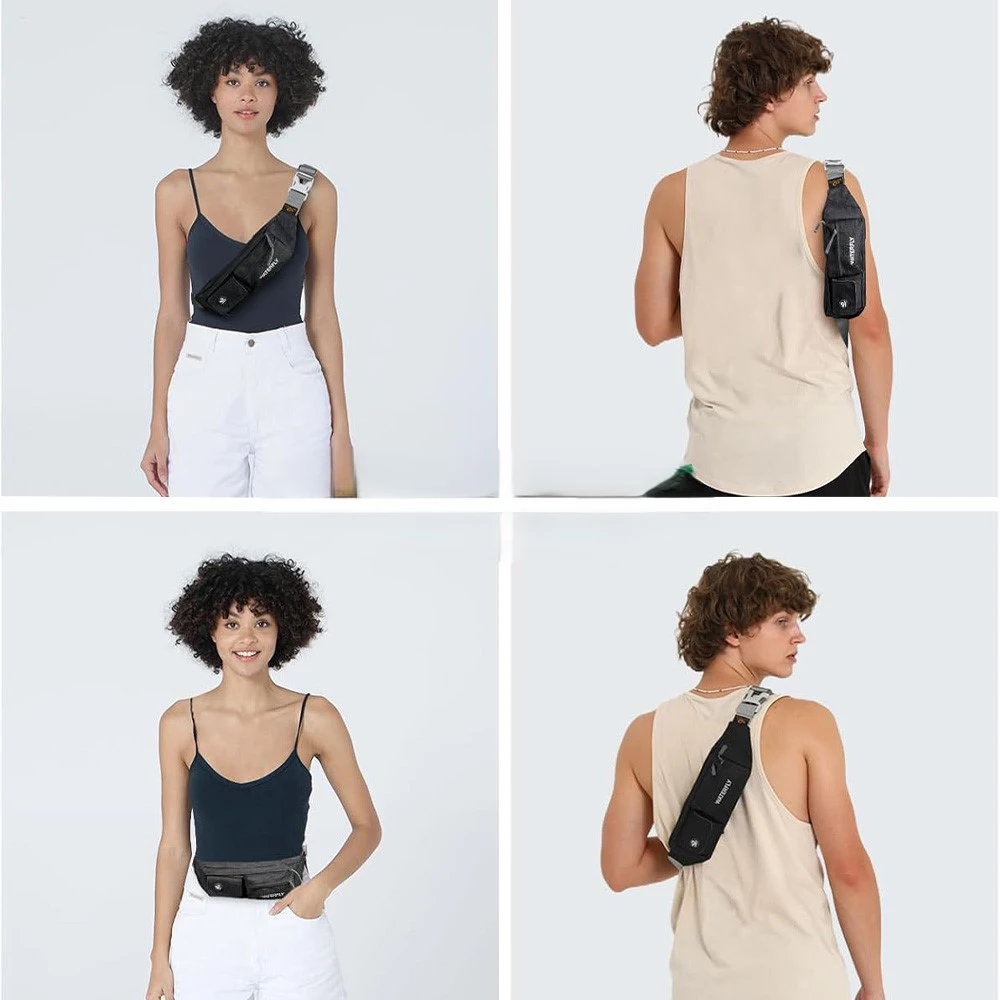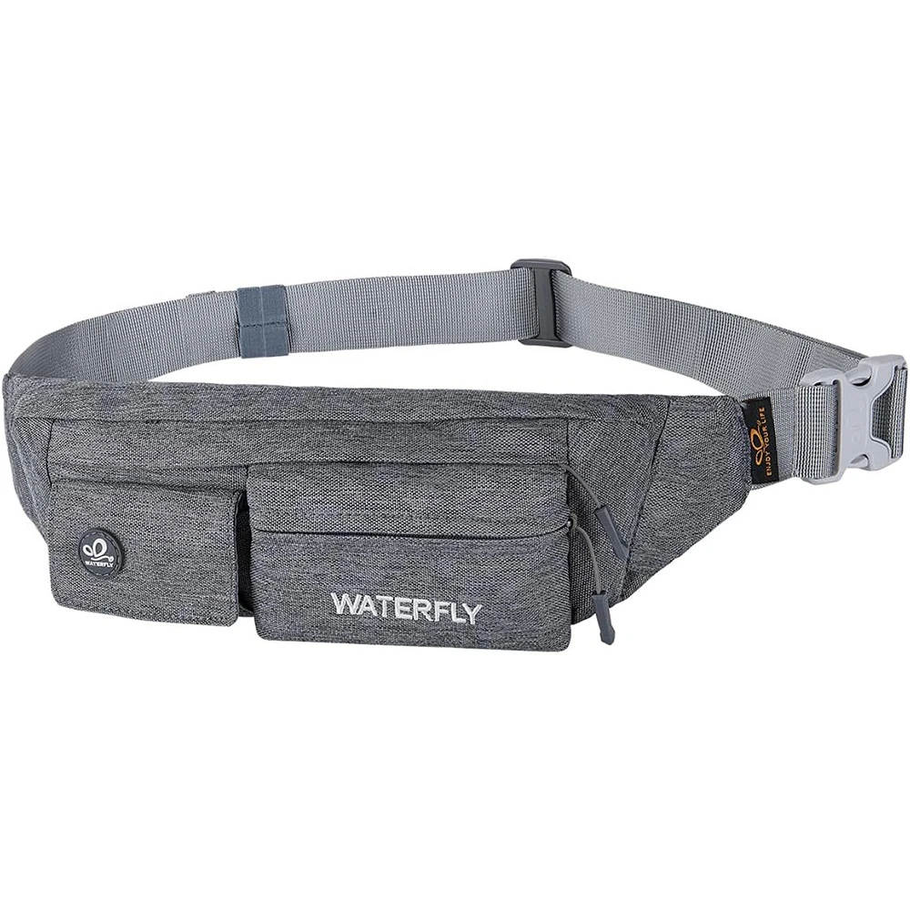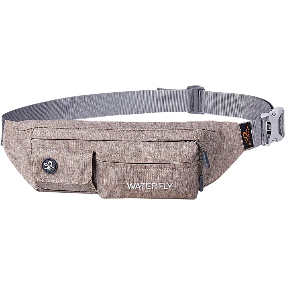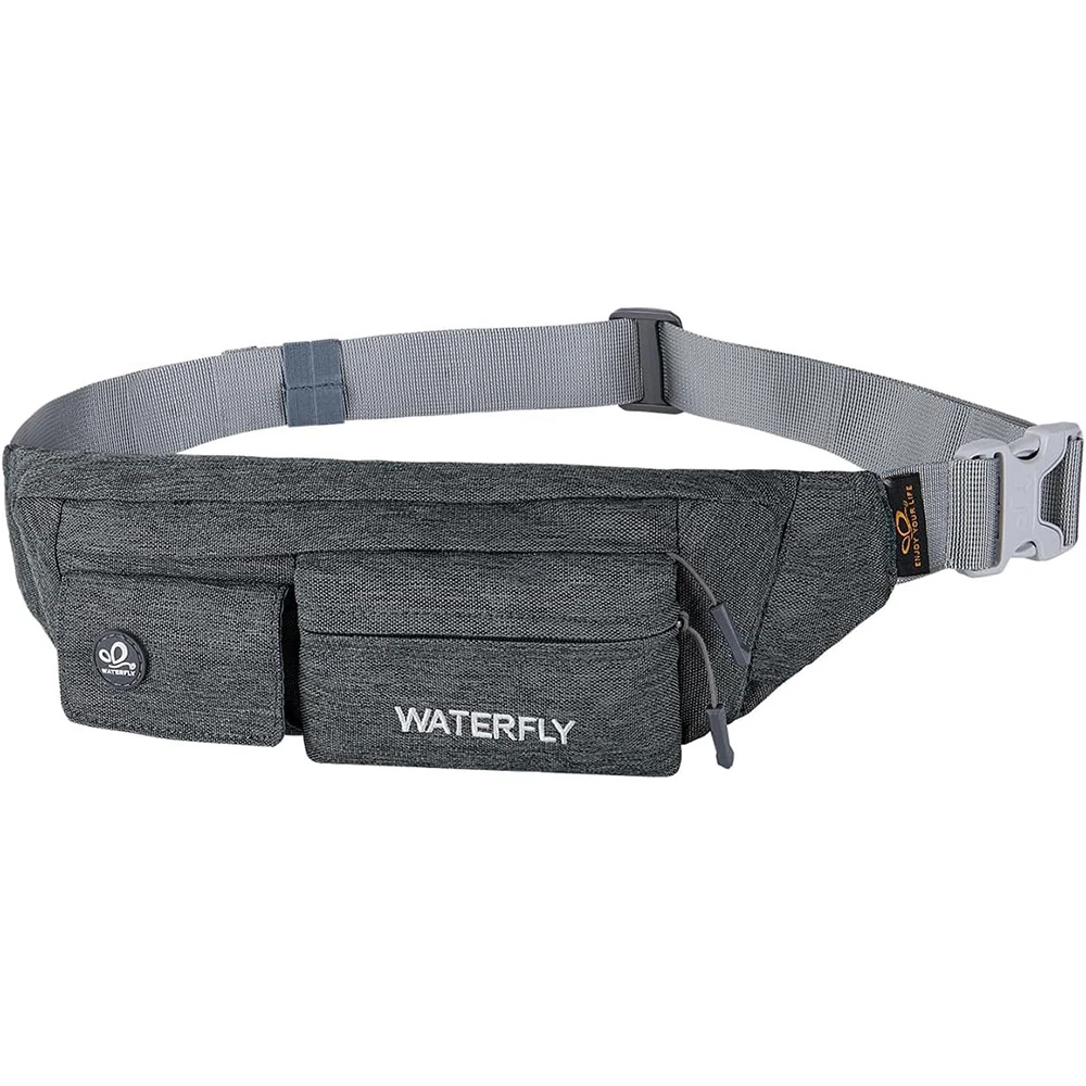 ightweight Compact Size: The slim fanny pack measures about 8"x2.5"x4.3" with only 5oz weight. You won't feel bulky when you wear it with all necessary stuff like phone, key, cards, cash and so on, suitable for running jogging dog walking biking hiking and other outdoor activities Multi Compartments And Anti Theft Pocket: There are 4 pockets on our fashion waist bag, including 3 front pockets and a hidden back anti theft pocket to store your passport or cash. The main compartment with a key hook is enough to store all phones under 6.5 inches Comfortable And Adjustable Belt: Waterfly belt bag with heavy duty soft nylon fabric is breathable and comfortable to wear. The fanny pack strap can be adjusted from 20~50", suitable for men women Water Resistant Fabric: The mini bum bag is water and sweat resistant. You don’t need to worry your stuff get wet anymore when you are outdoor or doing exercise in the gym. Please note do not immerse the hip bag into the water Different Styles To Wear: There are different ways to wear this stylish fanny pack. You can wear it on your waist, slant across your chest as a sling bag or hang it over the shoulder to match your wear