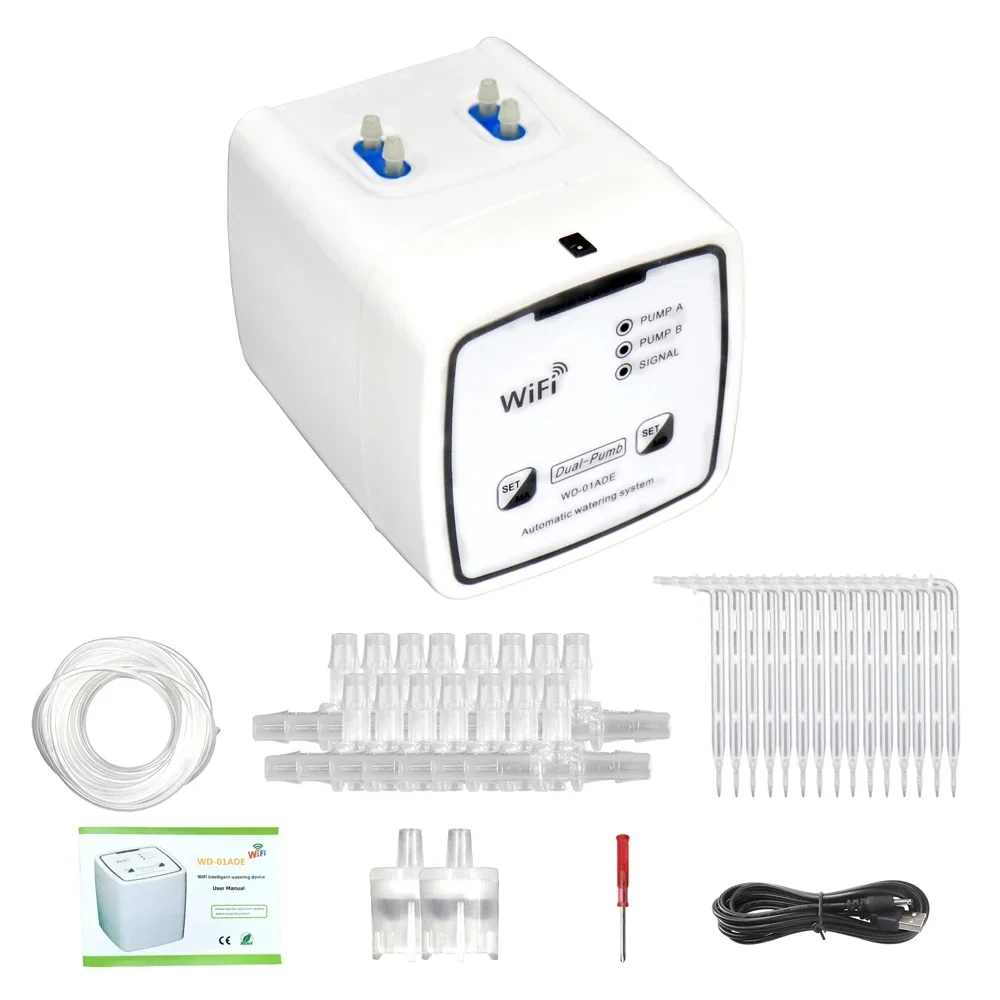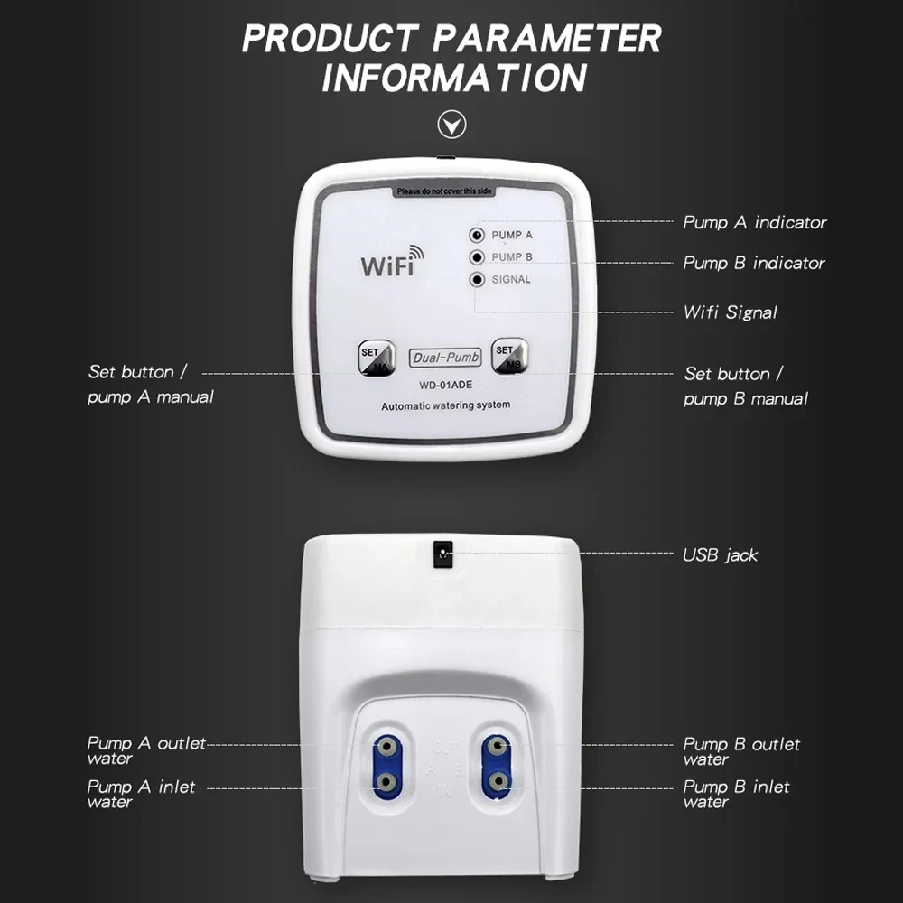 Intelligent automatic watering device can water plants regularly and quantitatively with simple settings. Even if you are on vocation or out, you don't need to worry about unmanned watering. It is suitable for home, office, garden, terrace, laboratory, agriculture, etc.