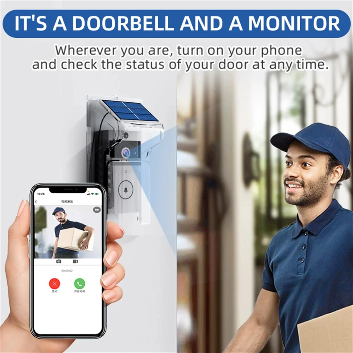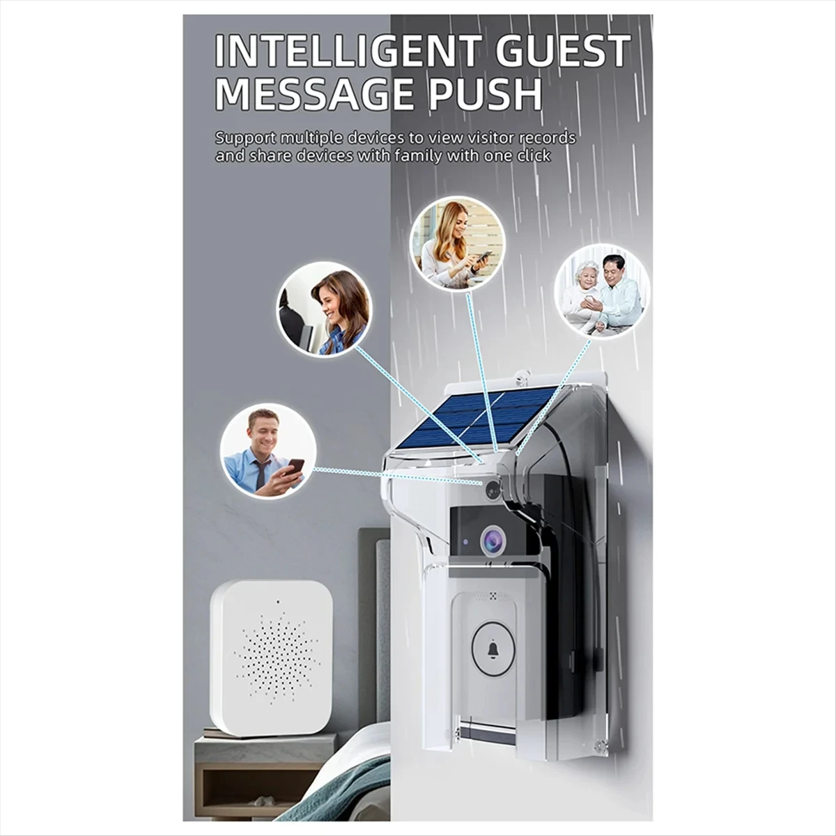 Enhanced Security Features: Equipped with advanced AI technology, this smart doorbell camera offers real-time facial recognition and motion detection, ensuring your home's safety day and night. Solar-Powered & Eco-Friendly: Enjoy the convenience of solar charging which provides a sustainable and uninterrupted power supply, eliminating the need for frequent battery replacements. Waterproof & Durable: Designed to withstand various weather conditions, this doorbell camera is IP65 waterproof, ensuring functionality in rain, sleet, or snow. High-Definition Night Vision: Capture clear footage even in low-light conditions with its superior night vision capabilities, providing you with crisp images and videos after dusk. Two-Way Audio Intercom: Communicate directly with visitors from anywhere via your smartphone, thanks to the integrated two-way audio system that ensures clear and instant communication. Colour:White Material:Plastic Package Contents: 1 * ringer 1 * button 1 * Video doorbell Only the above package content, other products are not included. Note: Light reflection and different displays may cause the color of the item in the picture a little different from the real thing. The measurement allowed error is +/- 1-3cm. ![]() ![]() ![]() ![]() ![]() |